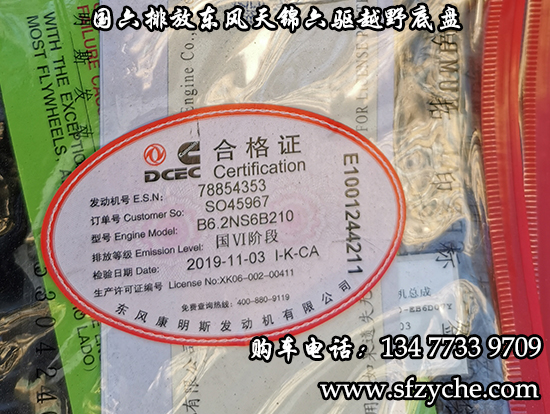 國六排放東風(fēng)天錦六驅(qū)越野底盤,東風(fēng)天錦D530一排半駕駛室,6×6驅(qū)動,康明斯B6.2NS6B210國六發(fā)動機210馬力,最大扭矩:850N.m/1100-1700rpm,排量6.2L、韶齒手動六檔變速箱,東風(fēng)德納車橋,前驅(qū)動橋4.5噸,中后橋都為軍工德納4.5噸驅(qū)動橋,大花紋越野輪胎,軸距3500+1250mm,電動玻璃,方向助力,斷氣剎,ABS,大燈自動調(diào)節(jié),自動調(diào)整臂,選裝原廠空調(diào)。