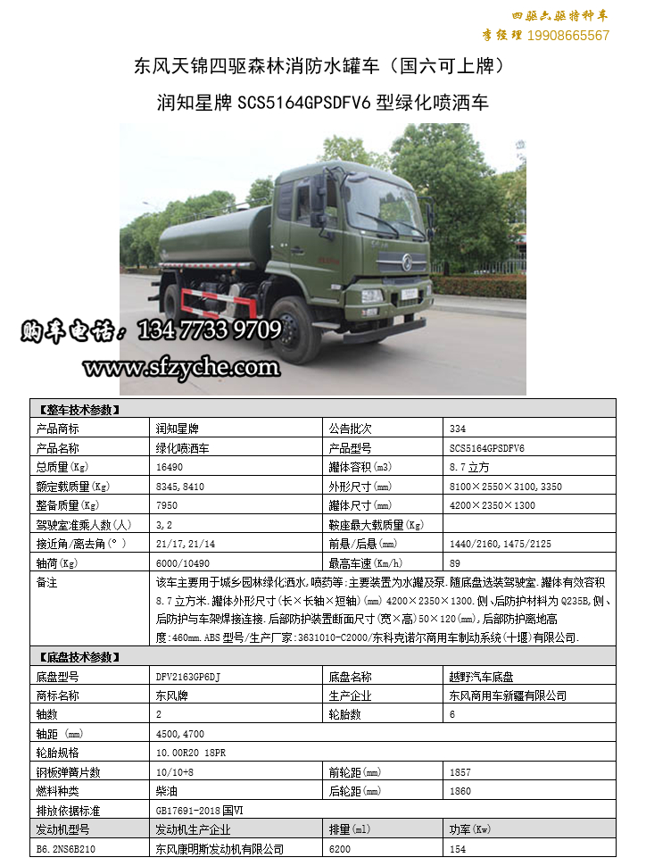 國(guó)六排放潤(rùn)知星牌SCS5164GPSDFV6型四驅(qū)越野綠化噴灑車,東風(fēng)天錦四驅(qū)森林消防灑水車,該車主要用于城鄉(xiāng)園林綠化灑水,噴藥等;主要裝置為水罐及泵.隨底盤選裝駕駛室.罐體有效容積8.7立方米.罐體外形尺寸(長(zhǎng)×長(zhǎng)軸×短軸)(mm) 4200×2350×1300.側(cè)、后防護(hù)材料為Q235B,側(cè)、后防護(hù)與車架焊接連接.后部防護(hù)裝置斷面尺寸(寬×高)50×120(mm),后部防護(hù)離地高度:460mm.ABS型號(hào)/生產(chǎn)廠家:3631010-C2000/東科克諾爾商用車制動(dòng)系統(tǒng)(十堰)有限公司.