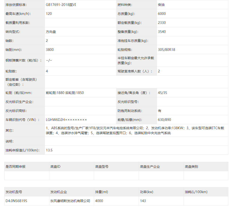 東風猛士民用版EQ2063EYY6J型長頭單排四驅越野底盤是東風越野車公司針對民用方面的首款軍轉民產品代表,其繼承東風軍用猛士的正規(guī)血統(tǒng),品質優(yōu)異,技術過硬。東風猛士民用版EQ2063EYY6J采用東風猛士M50型四驅底盤改造而成,采用東風康明斯D4.0NS6B195型國六柴油發(fā)動機,195馬力 ,排量4L帶增壓,最大扭矩600/1100-2200(N.m/r/min);猛士5擋軍用手動變速箱;分動箱為四輪全時驅動帶高低擋;軸距3800mm;整備質量3540kg;核定載質量2460kg;輪胎采用305/80R18MPT全鋼子午線輪胎,帶自動中央充放氣系統(tǒng);整車總質量6000kg,國六B排放全國可上黃牌,整車尺寸:5320*2310*1950mm;最小離地間隙388mm,最大垂直越障400mm,通過性強,適應高海拔極寒極熱地區(qū),全國暢行無阻,最高車速可達120km/h。