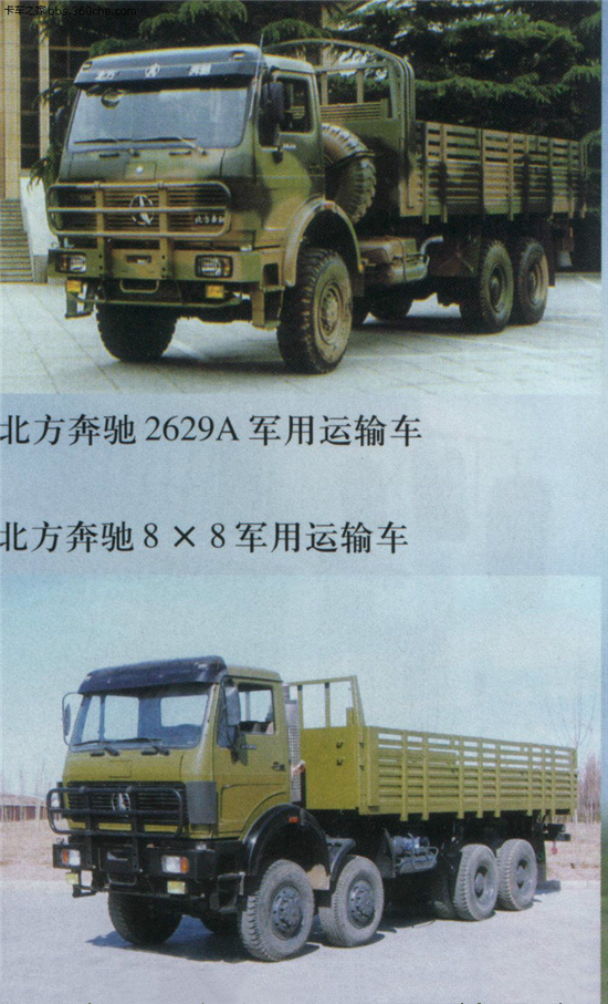 北奔7噸級(jí)4×4車型1926A軍用越野車和北奔10噸級(jí)6×6型2629A軍用越野車。