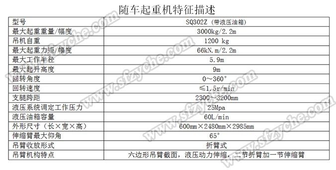 凈功率206kw; 起重機(jī)型號(hào)為:SQ302Z(帶液壓油箱),起重機(jī)質(zhì)量為:1200kg,最大額定超升載荷為:3000kg. 側(cè)防護(hù)金屬材料Q235斷面槽形,螺栓連接,斷面高度40mm,離地高度450mm; 后防護(hù)金屬材料Q235斷面槽形,螺栓連接,斷面高度135mm,離地高度500mm; 安裝具有衛(wèi)星定位功能行駛記錄儀,東風(fēng)越野隨車吊:m.kangtai12.com 吊機(jī)詳細(xì)參數(shù):