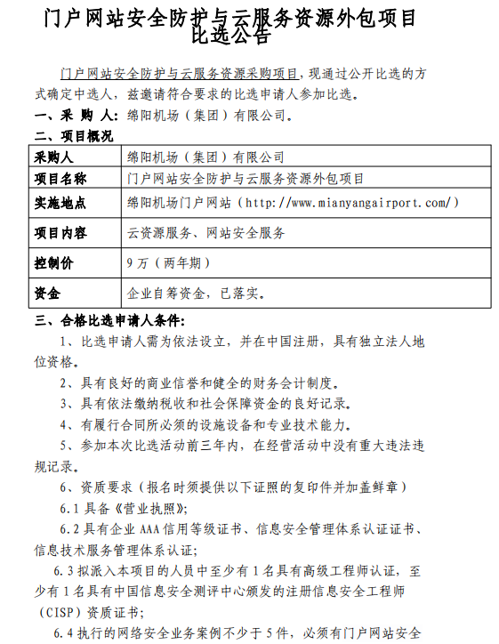 門戶網(wǎng)站安全防護與云服務資源外包項目比選公告