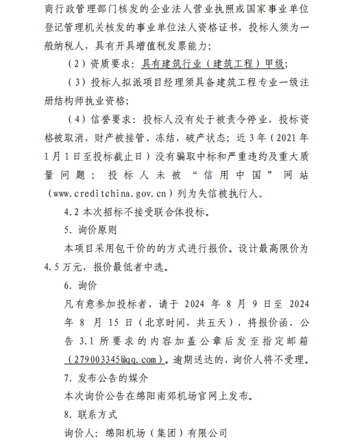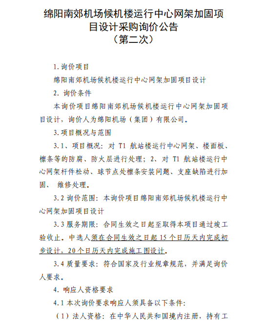 綿陽南郊機(jī)場候機(jī)樓運(yùn)行中心網(wǎng)架加固項(xiàng)目設(shè)計(jì)采購詢價(jià)公告(第二次)