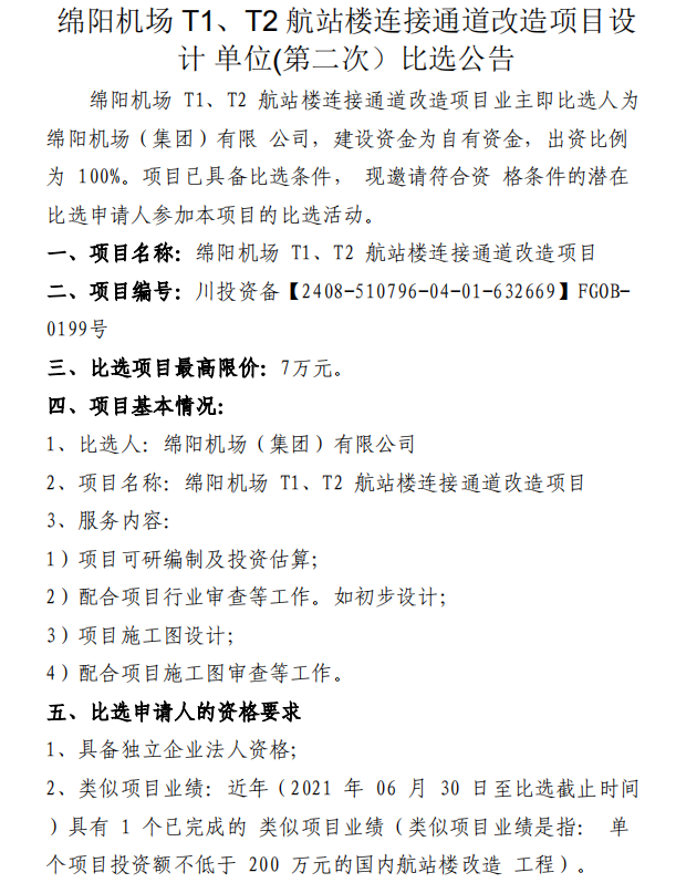 綿陽機(jī)場 T1、T2 航站樓連接通道改造項(xiàng)目設(shè)計(jì)單位(第二次)比選公告
